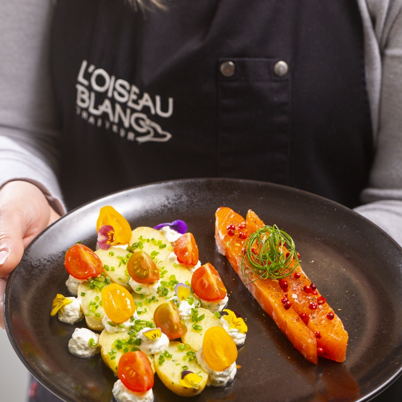 Réf. : AL0000819Plateau repas A Entrée : Terrine de lapin pistache et cranberries Plat : Truite de gravelax au Timut, pommes de terre grenaille et crème légère aux herbes fraiches Dessert : Dessert du jour