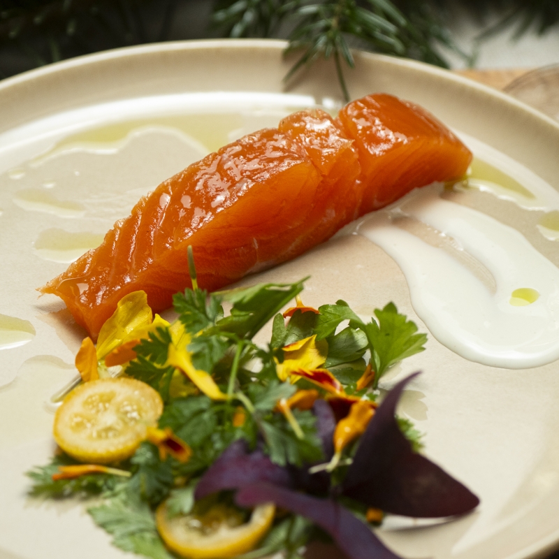 Vous êtes ici : Fêtes de fin d'année / Les pièces apéritives / Saumon confit sur pic, crème de raifort, 12 pièces