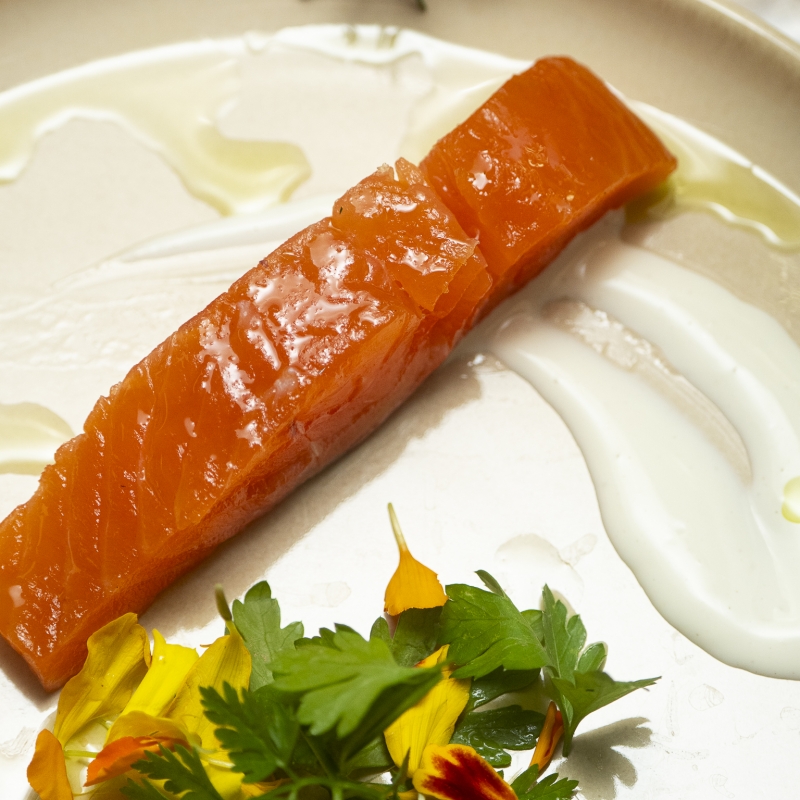 Saumon confit sur pic, crème de raifort, 12 pièces